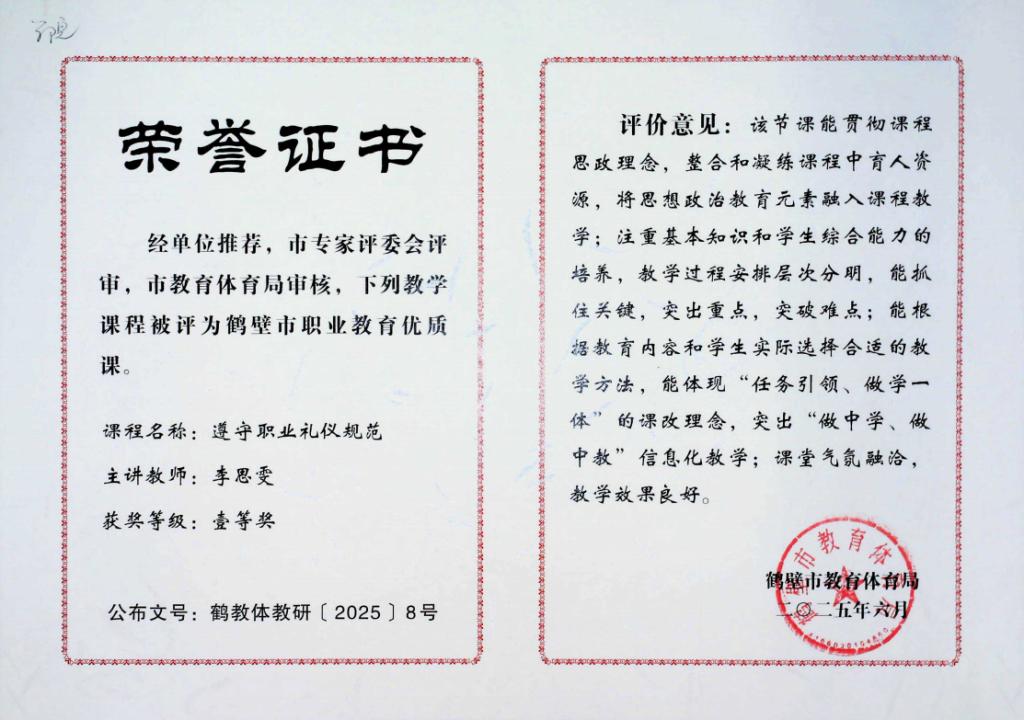 近日,我校马克思主义学院教师李思雯在2025年鹤壁市职业院校优质课教学评选活动中荣获一等奖。参赛教师紧扣职业教育培养目标,融入行业前沿案例,展现了我院优质课教学的丰硕成果。此次获奖不仅是对我院教师教学能力的肯定,更激励全院教师深耕教学一线,持续提升教学水平,为培养高素质技术技能人才奠定坚实基础。