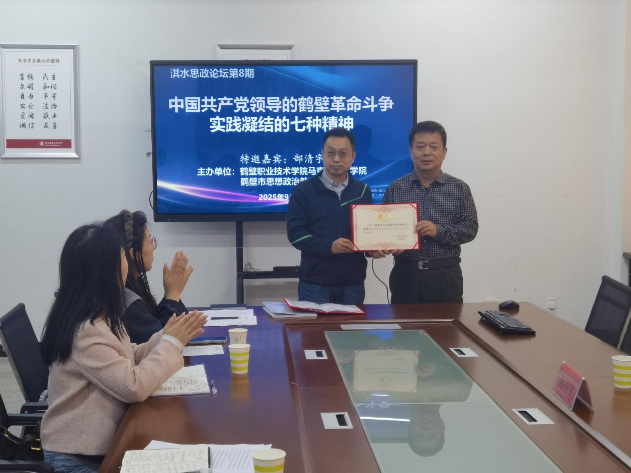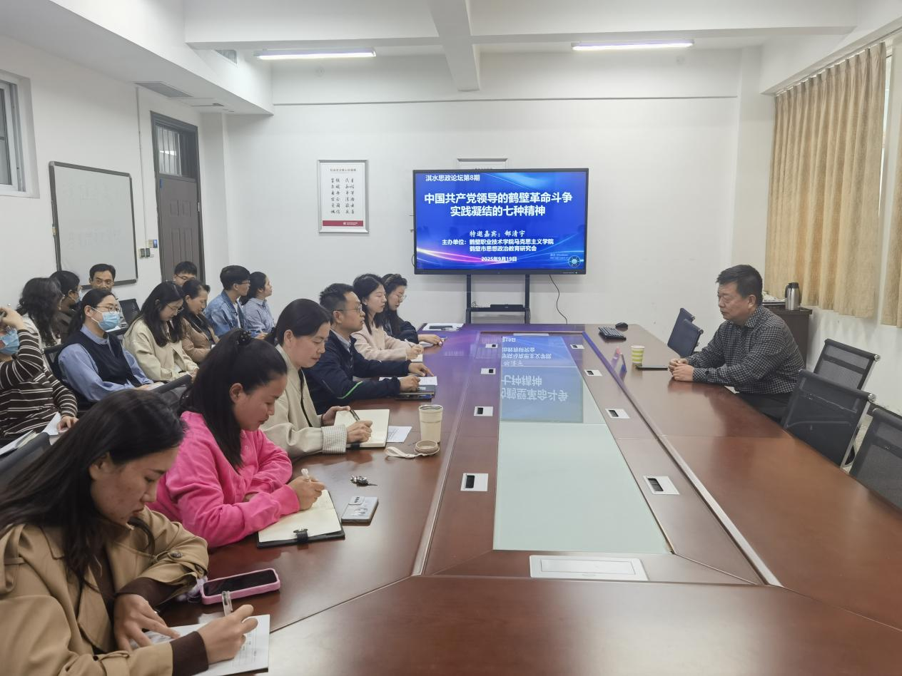 9月19日下午,第8期淇水思政论坛在马克思主义学院会议室举行。本期论坛由马克思主义学院和鹤壁市思想政治教育研究会主办,特邀鹤壁市红色传承促进会会长郜清宇做了题为“中国共产党领导的鹤壁革命斗争实践凝结出的七种精神”的报告。论坛由学院党总支书记、院长王勇强主持,全体教师及鹤壁汽车工程职业学院、鹤壁能源化工职业学院部分思政课教师参加。